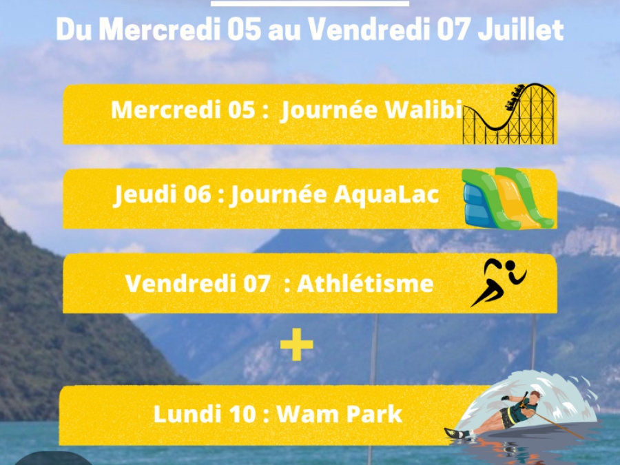 - Jeudi 06 Juillet : Journée à Aqualac Aix-Les-Bains. Le départ se fera en vélo du stade Mas Barral de Chambéry. Penser à prendre les vélos et casques.