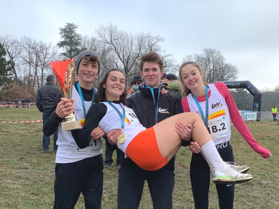 Samedi 18 décembre, 16 athlètes du club ont fait le déplacement à Firminy pour porter les couleurs du maillot du club aux championnats régionaux de relais de cross. 4 équipes mixtes (2 U20 et 2 séniors) se sont élancés sur une boucle de 2 km exigeante et vallonnée. L’équipe 1 junior et l’équipe 1 sénior se sont brillamment qualifiées pour aller au championnat de France de cross aux Mureaux. L’équipe jeune (Noé, Lily, Mathieu et Mado) s’est particulièrement distinguée en remportant la course devant Clermont Ferrand et Grenoble. Ils deviennent ainsi champions régionaux ! L’équipe 2 finit 11ème de la course. Les équipes séniors quant à elles prennent la 5ème place (4ème club qualifié) et la 13ème place.
