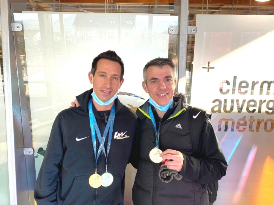 En M45, un sprinter pur Stéphane Simon et un sprinter hurdler Benoît Thommerel et en M65, un couteau Suisse (autre nom des combinards) Serge Le Thérizien. Sur le 60m Haies, Benoît est seul en lice et, malgré le manque d’émulation, réussit un beau 9’’14. Sur 60m, 5 M 45 forment la finale où sur la dernière foulée, Benoît devance Stéphane d’un centième 1er et 2ème en 7 ‘’89 et 7’’90. Sur 200m, Stéphane et Benoît gagnent leur finale respective, mais, au temps, Benoît a le titre (25’’28), Stéphane est vice-champion Régional (25’’41).