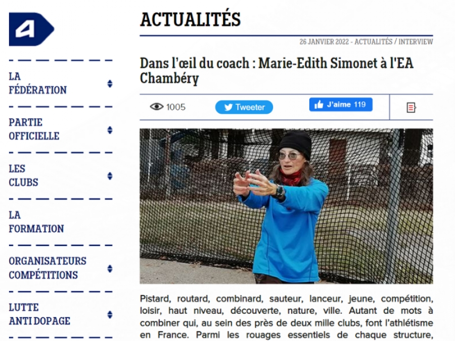 Pistard, routard, combinard, sauteur, lanceur, jeune, compétition, loisir, haut niveau, découverte, nature, ville. Autant de mots à combiner qui, au sein des près de deux mille clubs, font l’athlétisme en France. Parmi les rouages essentiels de chaque structure, l’entraîneur, quel que soit son profil, occupe une place à part. Athle.fr vous donne rendez-vous chaque mois avec ces hommes et femmes de l’ombre. Rencontre avec Marie-Edith Simonet, 61 ans, entraîneure à l’EA Chambéry.