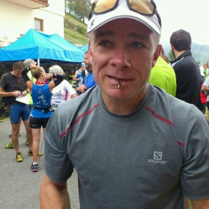 Sous un ciel brumeux le départ est donné à 8h30 depuis le petit village de Granier sur « le versant du soleil » au-dessus d’Aime. Après une brève traversée du village les choses sérieuses commencent avec un peu plus de 1300 m à avaler pour arriver au sommet de la pointe de Combe Bénite. Dès l’arrivée dans les alpages de Pra Spa nous débouchons au-dessus de la mer de nuage, la vue est alors magnifique à 360°, glaciers de la Vanoise, sommets du Beaufortain….mais pas le temps de rêver il reste encore 450m de dénivelé avant de basculer sur le col de Faillè. Un verre de Coca vite avalé et la descente continue jusqu’au Cormet d’Arêches. Le soleil chauffe déjà bien et il faut remonter par la crête herbeuse jusqu'à la Croix du Berger. 300m de D- pour rejoindre l’alpage de Plan Pichu tout au fond du vallon puis par un ancien chemin muletier nous remontons au col de Faillè et cheminons sur le versant Est de la pointe de Combe Bénite qui nous ramènera au lieu-dit Tiabord. Nous retrouvons ensuite le chemin de la montée, s’en suit une longue descente jusqu’au village pendant laquelle mes quadris ont bien chauffé. Enfin l’arche d’arrivée après 4h 31 d’efforts et une 67 ème place. Cela vaut bien une bonne bière que j’apprécie autant que le repas champêtre d’après course.